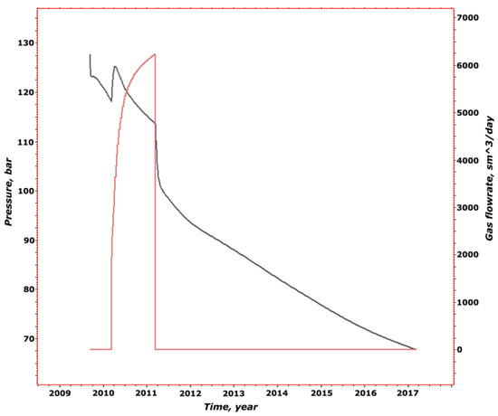 A number of simulations of the process of enhanced coalbed methane recovery with the simultaneous injection of carbon dioxide into the coal seam were conducted. Changes of average pressure in the injection zone, flowrates of CO2 injection and the daily production rates of water and methane were recorded during the simulation (Figure 7 and Figure 8).
