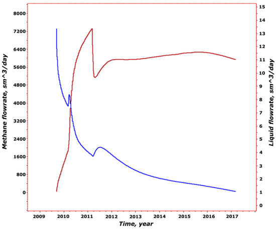 Figure 7 shows the changes of average pressure in the CO2 injection zone and the daily flowrate of the CO2 injection. In the simulation, three intervals of time were separated. During the first six months of the simulation, water is produced from the coal seam, which causes the decrease of pressure in the reservoir. The fall of the pressure initiates methane desorption from the coal matrix (Figure 8). After six months from the start of the simulation, the injection of CO2 into the coal seam begins and lasts uninterruptedly for one year. In the first month of injection, a sudden increase in pressure can be observed, but in the following months a marked drop in pressure is noticeable. Figure 7 shows a significant decline in reservoir pressure after the end of CO2 injection. Moreover, the decrease of methane production and the increase of water production can be observed in the first month after the end of the CO2 injection (Figure 8). The simulation of the process of gas migration after the injection has been finished is continued for 5 years. At that time, a constant drop of reservoir pressure can be observed to the end of simulation (Figure 7). Moreover, Figure 8 presents the stabilization of methane production and a decrease in its efficiency in the final phase of the simulation.