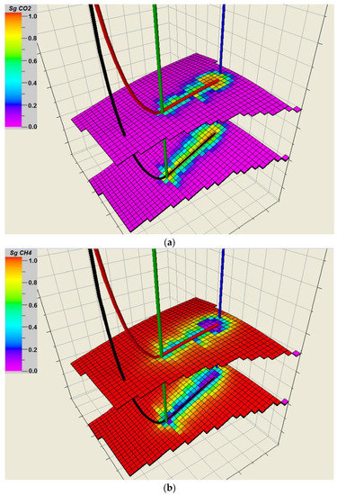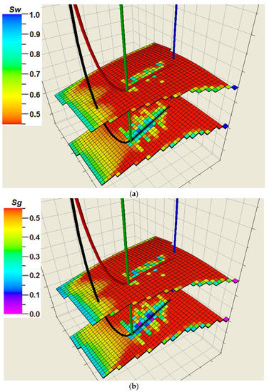 Changes in water saturation—Sw (a) and gaseous phase—Sg (b) in the fractures after 5 years from the end of CO2 injection.