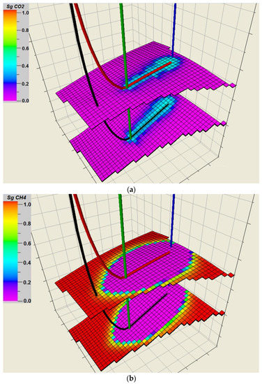 Changes in gas saturation-Sg: (a) CO2 and (b) CH4 in fractures after 1 year of CO2 injection (mole fractions of gases in fractures).