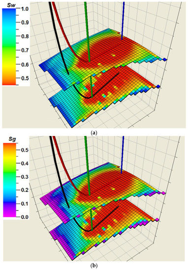 Changes in water saturation—Sw (a) and gaseous phase—Sg (b) in the fractures after 1 year of CO2 injection.