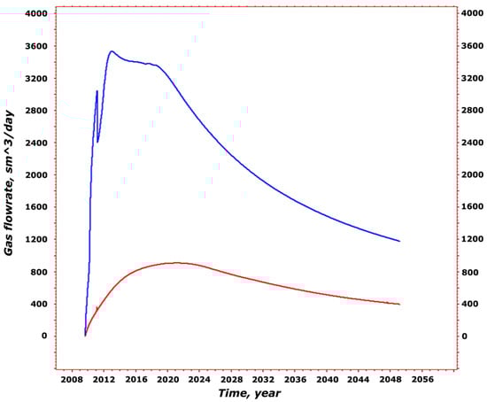 Daily CO2 injection rate (the red color signifies the results of the simulation taking into account the phenomenon of coal matrix shrinking and swelling, while the blue one represents the simulation results, which do not include the phenomenon).