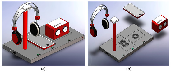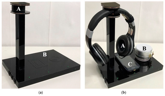The proposed device prototype was implemented according to the proposed design described in Section 2.2. The final wireless power hanger/stand pad prototype is shown in Figure 18a. The coils and WPT modules applied to the developed device were put into a fit casing made using acrylic material. The base charger pad size is 24 × 16 × 2 cm, with two transmitter coils for portable electronic device wireless power charger functionality, while the dimension of the headphone hanger is 2 × 3 × 16 cm with a wireless power charger pad on the top.