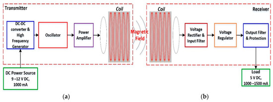 Figure 4a shows the proposed wireless power transmitter. It was designed based on an inductive electromagnetic coupling and complies with international standard wireless power. A DC–DC and boost regulator converter is used to convert a low voltage (DC power source) to suitable power for high frequency and oscillator parts. A power amplifier is used in the proposed apparatus to generate a stable, high-power electromagnetic wave. The wireless power transmitter’s main part and transmitter coil together emit a stable, high-frequency electromagnetic wave.