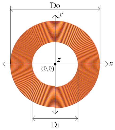 In this work, a circular, flat spiral air-core was chosen to be applied in the proposed device WPT system. This geometry has been widely used in wireless power transfer applications to improve power transfer performance and misalignment tolerance compared to other coil geometries [18,19]. Several coil structures with different coil parameters were numerically analyzed using the method presented in [17] to obtain the proper vertical magnetic field (Bz) distribution and transmitting area for the proposed device. The evaluated coil geometry is a circular flat spiral air-core coil as shown in Figure 5, which has parameters as shown in Table 1.