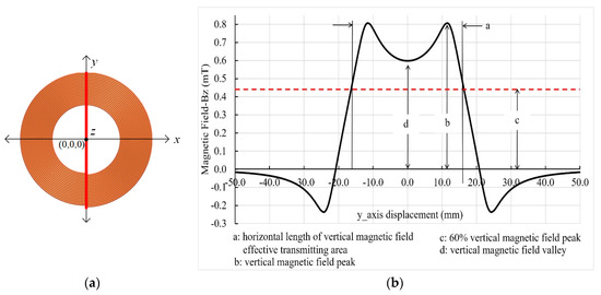 The evaluated coils analyzed and evaluated along the y-axis with the evaluation criteria that the vertical magnetic field distribution valley (Bz valley) is not less than 60% of the vertical magnetic field peak/max (Bz peak/max), the difference between the Bz peak/max and Bz valley is relatively small, and the magnetic field effective transmitting area is as wide as possible. The evaluation path and vertical magnetic field distribution characteristic curve along the y-axis are both shown in Figure 6.