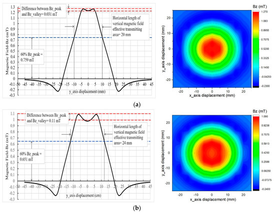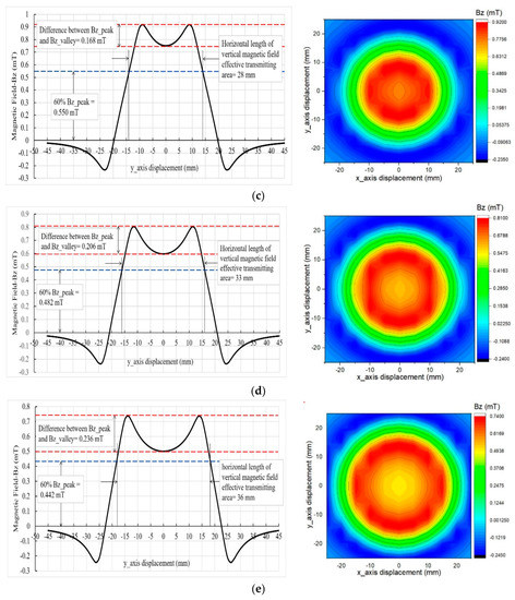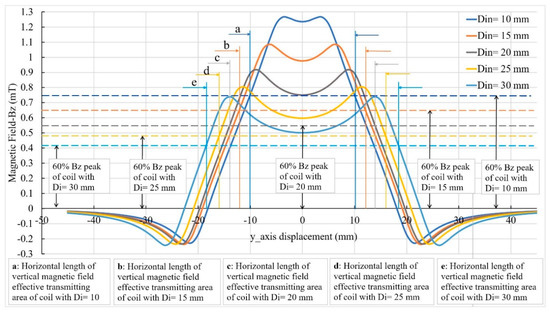 As shown in Figure 7, among the evaluated coils, the coil with Di = 10 mm has the highest Bz peak/max (1.266 mT) with Bz valley = 1.235 mT, 60% Bz peak/max = 0.759 mT, and the horizontal length of the vertical magnetic field effective transmitting area = 20 mm (the detail of Bz distribution characteristic curve is shown in Figure 8a). While the coil with Di = 30 mm has the lowest Bz peak/max (0.737 mT), with the Bz valley = 0.501 mT, 60% Bz peak/max = 0.442 mT, and the horizontal length of the vertical magnetic field effective transmitting area = 36 mm (the detail of Bz distribution characteristic curve is shown in Figure 8e).