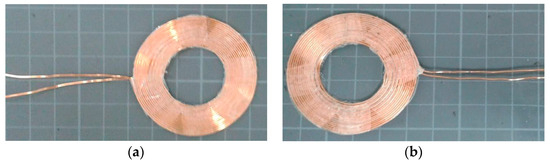 The receiver coil was designed with the same diameter and parameters as well as the transmitter coil to maximize the coupling efficiency. In the implementation, the receiver coil is characterized by 14.02 µH of L, Do is 48.50 mm and Wl is 1925 mm because of manual manufacturing. The receiver coil geometry is shown in Figure 9b. A small receiver coil geometry was also designed to achieve compatibility with a modified wireless headphone. This coil is characterized by 13.89 µH of L, having 26 and 2 number of turns and layers, respectively. Di is 10 mm, and Do is 28.5 mm as shown in Figure 10.