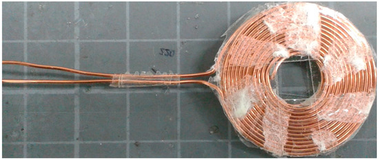 According to the calculations using Equation (13), in the case of a single circular flat spiral air-core coil having 17 and 1 number of turns and layers, respectively, if Di is 25 mm, P is 0.03 mm, and W is 0.643 mm, then L, Do, and the wire length (Wl) are 13.9 µH, 47.89 mm, and 1919.7 mm, respectively. An AWG 22 wire was chosen because of its small diameter (0.643 mm diameter and 0.0646 mm insulating layer) and the fact that it can be used for carrying a maximum current of 7 A. However, due to manual manufacturing, the transmitter coil is characterized by L is 13.7 µH and Do is 48.36 mm. The transmitter coil’s geometry is shown in Figure 9a.