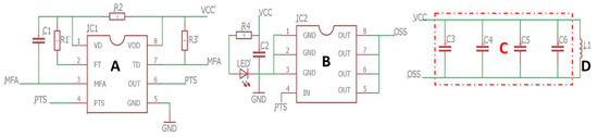 The wireless power transmitter module is composed of three main parts, as described in Figure 11. Part A is a high frequency generator made up of a radio frequency power supply chip (XKT–412), R1 = 8.2 kΩ, R2 = R3 = 47 kΩ, R4 = 10 kΩ and C1 = 1 nF/50 V. This chip automatically generates a square wave (PTS pin) with a frequency of around 70 kHz. It can produce a voltage of 7 V and a maximum current of 1 Ampere.