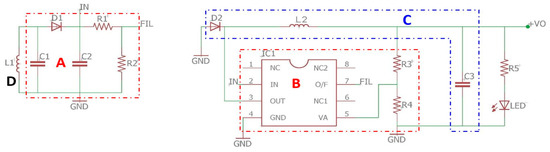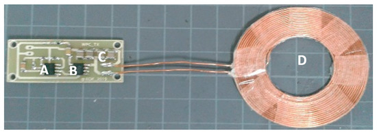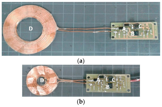 Wireless power receiver prototype: (a) coil with Di = 25 mm; (b) coil with Di = 10 mm. Part A is a voltage rectifier and input filter, part B is a voltage regulator, part C is an output filter and protection, and part D is a receiver coil.