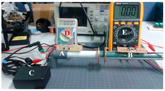 Experimental setup. A is the wireless power transmitter apparatus, B is the wireless power receiver apparatus, C is the direct current (DC) power source, D and E are the multimeter.