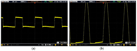 The developed wireless power transmitter apparatus operates at a 110 kHz operating frequency. Figure 16 shows the experimental waveforms generated by the radio frequency power supply chip and the wireless power transmitter chip in conjunction with an oscillator part. The radio frequency power supply chip generates a square wave with the output voltage of 7 V and an output frequency of about 70 kHz. The measured waveform results are shown in Figure 16a. Figure 16b shows the T5336 chip and oscillator wave output which is controlled by the radio frequency power supply chip. The waveform is a sinusoidal wave with an amplitude of 32 V and frequency (operating frequency) of about 110 kHz. This operating frequency is in compliance with the WPC standard.