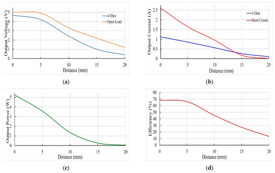 Those decrease gradually with the increase in the distance between the transmitter and receiver coils because of the high transmission coupling loss, as shown in Figure 17a–c.