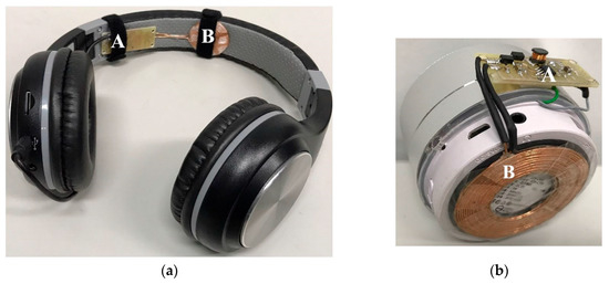 The developed wireless receiver module installation: (a) on the wireless headphone (part A is receiver module and part B is receiver coil); (b) on wireless portable audio speaker (part A is receiver module and part B is receiver coil).