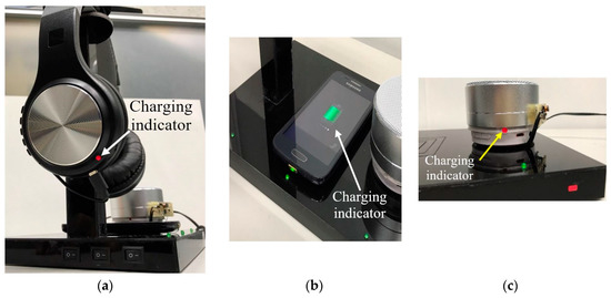 Built-in battery charging testing: (a) charging testing on wireless headphone; (b) charging testing on smartphone; (c) charging testing on wireless portable audio speaker.