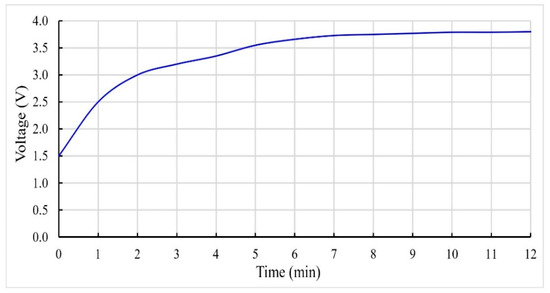 The charging curve was experimentally obtained by measuring the wireless headphone battery voltage being charged, as shown in Figure 21. A 3.7 V 300 mAh Polymer Lithium rechargeable battery was used to perform the charging curve experiments. The measurement and recharging process stopped after 12 min of the charging process because the battery voltage remained constant. The charging process can still be continued to increase the battery power capacity and it takes 1 h charging time to achieve full battery power capacity.