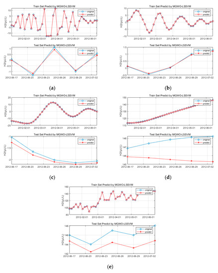 Prediction results of H2 by the GRA-EMD-MGWO-LSSVM model. (a) intrinsic mode function 1 (IMF1); (b) IMF2; (c) IMF3; (d) residual and (e) H2.