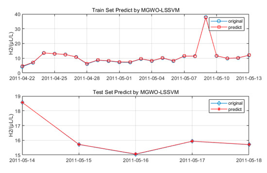 In order to verify the validity of the proposed model, the prediction model was compared with several models. The comparison results were shown in Table 3 and Table 4. For the prediction models in Table 3, only the dissolved gas concentration data were used as the input without processing by EMD. In Table 4, the dissolved gas concentration data processed by EMD were used as the input of EMD-PSO-LSSVM, EMD-GWO-LSSVM and EMD-MGWO-LSSVM, respectively, while for GRA-EMD-PSO-LSSVM, GRA-EMD-GWO-LSSVM and GRA-EMD-MGWO-LSSVM, the transformer load, oil temperature, ambient temperature and the EMD processing results were used as the input.