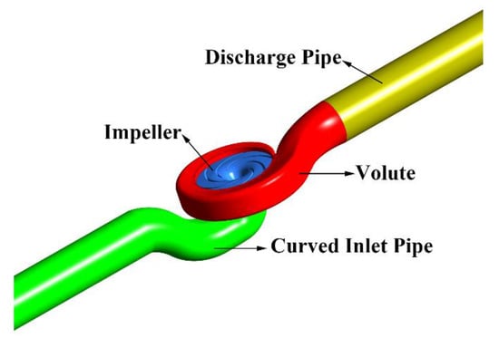 Figure 1 shows the original model, and Table 1 lists the main parameters. As shown in Figure 1, the flow domain was divided into four parts: inlet pipe, impeller, volute, and discharge pipe, which could simplify the meshing process. The specific speed of the original vertical inline pump is 132.36 rpm, and the definition is given as follows: