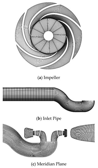 In the process of numerical simulation, it is widely known that the quantity and quality of grids has great influence on the computational speed and accuracy. In this research, the flow domain was divided into four parts (see Figure 1). As shown in Figure 2, the structural cells and multi-block strategies were applied to mesh each part using the commercial pretreatment software ANSYS ICEM. Meanwhile, the grids near walls were refined to achieve the accurate results near the boundaries. The non-dimensional wall distance (y+) was applied in the evaluation of the grids. The figure for the significant surfaces, such as the leading edge of the impeller, was from 5 to 10, and the max value in the whole passage was less than 80. Hence, the grids condition was enough for the characteristic calculation.