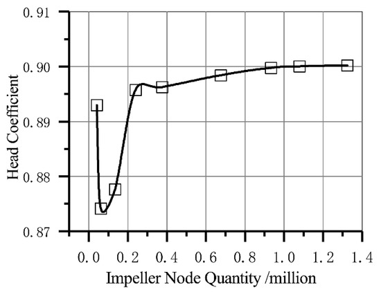 A grid sensitivity study was also carried out to improve the reliability of the computational grids. Figure 3 gives the results of this study. Formula (2) shows the definition of the head coefficient . The figures for the head coefficient of the vertical inline pump was going to be stable when the impeller node quantity was greater than 0.9 million. Therefore, the final grid size of each component was set to this figure during the optimization process and the final calculational grid number of the inlet pipe, the impeller, the volute, and the discharge pipe were 1.36 million, 0.93 million, 1.21 million and 0.78 million, respectively.