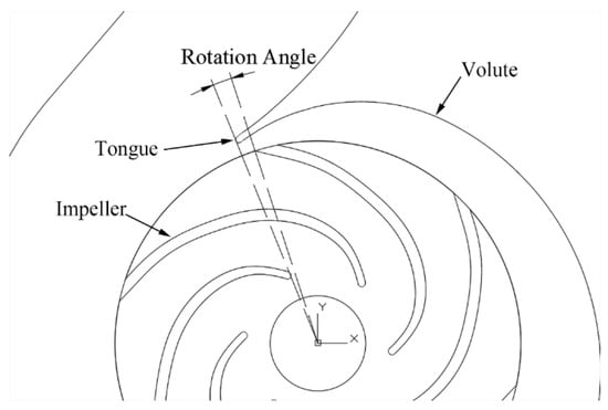 Additionally, the influence of different impeller position on the characteristic of the inline pump was studied in order to ensure the reliability of the computational results. The relative position between impeller and volute is defined as Figure 4, and the computational results are given in Figure 5. When compared with the experimental results, the case with the impeller rotating 37 degrees showed better performance. Hence, this relative position was applied in the optimization process.
