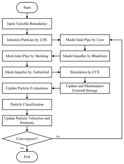 As the number of design variables was large, it will cost too much to optimize the impeller and the inlet pipe using surrogate model. In this research, an optimization procedure based on a modified multi-objective particle swarm optimization algorithm was proposed to solve this problem. Figure 6 gives the flow chart of the optimization process.