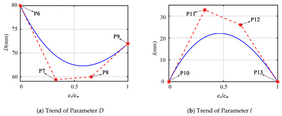 The horizontal coordinates are relative positions and the longitudinal coordinates are the control objects. The control points of the Bezier curve of blade thickness are evenly distributed in the transverse direction, that is, the transverse coordinates of the control points are 0, 33.33, 66.66 and 100, respectively, in order to reduce the number of design variables. The coordinates of each control point were used as the design variables in the optimization process.