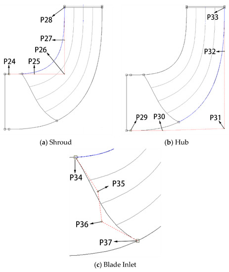The axial projection diagram of the impeller is mainly composed of three elements, namely, the shroud, the hub, and the blade inlet. To realize the parametric control of the impeller axial shape, two fourth order Bezier curves were used to fit the shroud and the hub of the impeller, and a third order Bezier curve is used to fit the blade inlet shape, as shown in Figure 10.