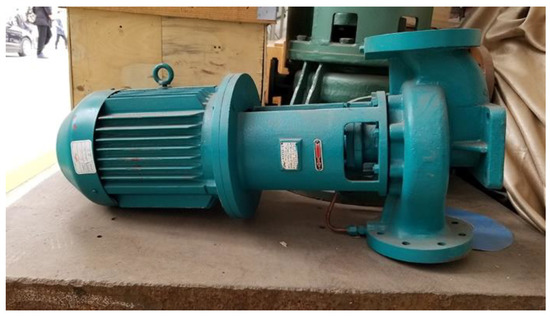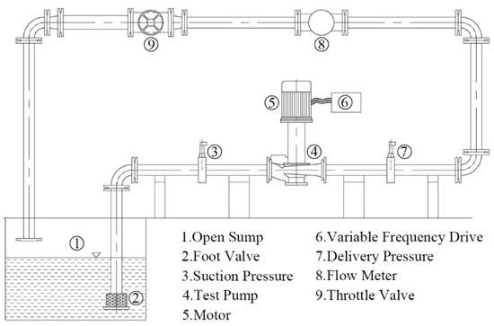 A validation experiment was carried out to ensure the reliability of the numerical results. Figure 11 shows the experimental pump, and Figure 12 shows the test rig. The characteristic test of the original vertical inline pump was carried out on the open-loop in National Research Center of Pumps, Jiangsu University. The measurement errors of head and efficiency were less than ±2%, and the figure for flowrate was less than ±2%. The WIKA pressure sensor was used to measure the inlet and outlet pressure of the pump, with the range of 0–1.6 bar and 0–4 bar respectively. The flow rate of the pump was obtained by the electromagnetic Flowmeter (KROHNE-UFM 3030), and the input power of the pump was recorded by the power meter. In the experiment, the variable frequency drive controlled the rotational speed of the motor, and the flow rate was adjusted by adjusting the throttle valve. At the same time, repeated tests were carried out to ensure the reliability of the results.