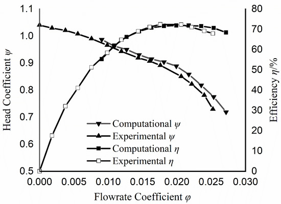 As shown in Figure 13, dimensionless parameters show both the test results and the calculated results. The computational results showed good agreement with the experimental results. The head coefficient is defined as Formula (2), and the flow coefficient used in the diagram is defined, as follows: