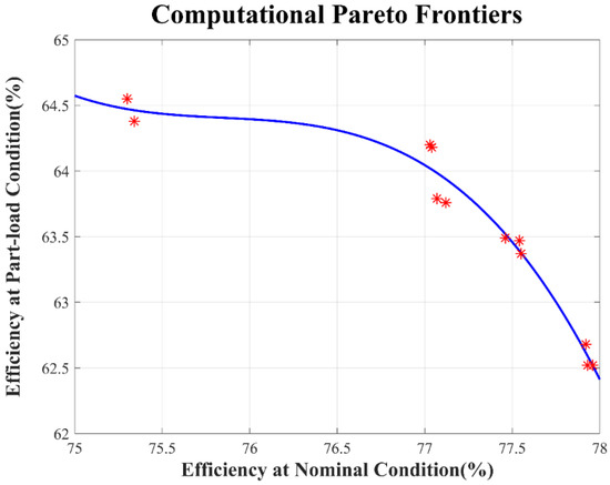 The calculated Pareto frontiers are shown in Figure 14, and the performance data is given in Table 2, and the main design parameters are shown in Table 3. When compared with the original model, the optimized cases have higher efficiency and the heads can also satisfy the design conditions. For the part-load condition, the maximum efficiency increase after optimization is 8.06%. When compared with the original model, the optimized cases have obvious decreases in terms of input power, and the heads do not have obvious fluctuation. For nominal flow conditions, the maximum efficiency increase after optimization is 7.33%. In terms of input power and head, there is a great difference between different results.