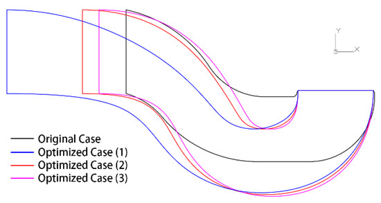 Figure 15 shows a comparison of profiles for inlet pipe between the three selected models and the original case. The black line represents the original model, blue represents the optimized case (1), red represents the optimized case (2), and pink represents the optimized case (3). As shown in the diagram, the transverse length of the inlet pipe of the optimized models is longer, and the relative position of the second bend is further away from the outlet. Specifically, the transverse lengths of the three optimization models decrease in turn, with optimized case (1) being the longest, whereas optimized case (3) is the shortest. The curvature of the first bend of the optimized case (1) is relatively smaller, and the transition section between the first bend and the second bend is longer.