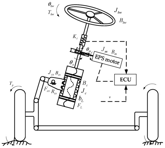 The mathematical model [23] of HP-EPS mainly includes a steering wheel, an input shaft, a recirculating ball steering gear, a power-assisted motor, and a super capacitor. Its schematic of dynamic model is shown in Figure 2.