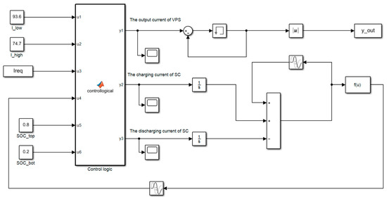 The fitness model is established in MATLAB/Simulink as shown in Figure 3. The inputs are the required current of EPS , the real-time SOC, the two initiated current threshold parameters and . According to these inputs, the energy management strategy program, which is interpreted to Matlab code based on Table 1, calculates and distributes the output current of the VPS and the charging current or discharging current of SC. The quantity of electric charge of SC is obtained by the integral of or . Adding the obtained quantity of electric charge and the remaining quantity of electric charge of SC, the updated SOC of the super capacitor is obtained by Equation (7) and the output current of the VPS is updated. Finally, the real-time current fluctuation is obtained by accumulating the real-time in the PSO program.