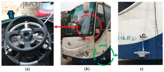 The test vehicle and experimental apparatus: (a) MSW DTI sensor universal measurement steering wheel; (b) the test vehicle and the installation position of experimental apparatus; (c) Correvit S-Motion DTI Non-contact optical sensor.