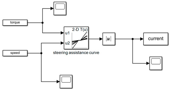 The required current of EPS is determined by the assist characteristics which includes linear, folded and curvilinear assist characteristics. Considering the linear assist characteristics are easier to implement and be controlled, a linear curve of assist characteristics is designed. The steering resistance torque and drivers’ preferred steering torque at different vehicle speeds as well as the required current of EPS are obtained in Reference [26] as shown in Table 3. The simulation model of assist characteristics is built as shown in Figure 7. The inputs of the model are the vehicle speed and torque, and the output is the required current of EPS. To input the collected information into the assist characteristic model, the required current of the EPS during the test (as shown in Figure 8) is obtained.