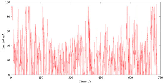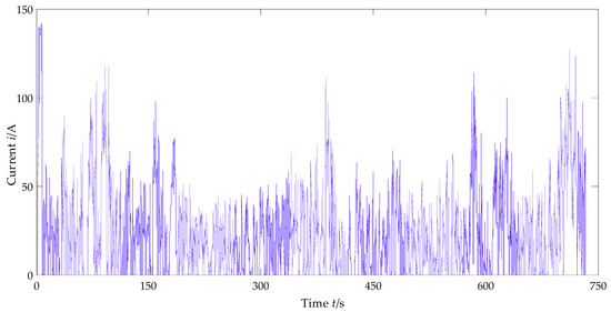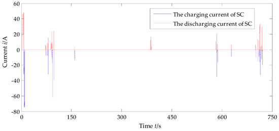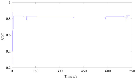 The charging and discharging current of the super capacitor are shown in Figure 13. Compared with Figure 11, it can be found that when the required current of EPS is higher than 93.6 A, the output current of the vehicle power supply is 93.6 A, and the lacking current is provided by the super capacitor, which acts the ‘peak clipping’ effect of SC; when the required current of EPS is lower than 74.7 A, the SOC of SC is checked to decide whether it needs to be charged. If necessary, the output current of the VPS is adjusted to 74.7 A, which not only meets the needs of the EPS, but also supplies power to the SC. In this way, the ‘valley filling’ effect of SC is exerted and the output current of the VPS is more stable. It can be seen from Figure 13 obviously, the charging current of SC is higher than the discharging current, which ensures that the SOC of SC keeps high and stable so that the SC has better current peak absorption especially when the required current of EPS is high. The SOC trend of SC is shown in Figure 14.