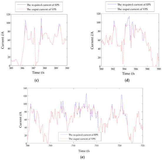 The detailed comparison results of the VPS output current between before and after optimization: (a) the comparison from 0 to 10 s; (b) the comparison from 80 to 100 s; (c) the comparison from 385 to 390 s; (d) the comparison from 580 to 590 s; (e) the comparison from 700 to 725 s.
