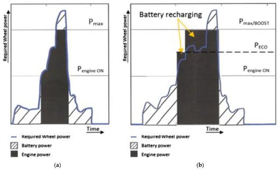 Comparison between electric vehicle (EV) charge sustaining strategies with range extenders (REs): (a) variable engine load mode following instantaneous electrical demand and (b) dual power set point engine mode (ECO/BOOST) used in the present work, adapted from [2].