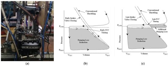 (a) Engine in the test dynamometer; pumping losses for early intake valve closure (EIVC) (b) and late intake valve closure (LIVC) (c) strategies, adapted from [35].