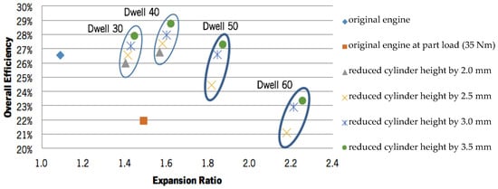It is possible to perform a simplified geometric analysis to the effect of changing the intake valve closure timing and reducing the cylinder height on the trapped compression ratio and on the corresponding brake efficiency gains. Assuming that the component of the mechanical losses does not change, it is possible to correct the theoretical efficiency and indirectly the brake efficiency. This was done in a previous work [37] and is shown in Figure 3. It can be noticed that increasing the level of over-expansion first causes an increase in the efficiency for ERs up to around 1.6. This increase is associated with the rise in the expansion work provided by over-expansion. However, for ER values higher than 1.6, the overall efficiency starts falling. This excessive valve dwell causes the thermodynamic improvement obtained for the indicated engine cycle no longer compensating for the loss of net mechanical power produced with such a small effective intake stroke. Under these conditions, the low mechanical power produced starts being substantially deprecated by the mechanical losses. That is why an optimal dwell value exists for an intermediate ER value. Note that the mechanical losses of the over-expanded engine will actually be smaller than those of the original Otto cycle engine, as the piston skirt friction forces will be lower due to the shorter effective compression stroke. This is one of the reasons why the efficiency figures displayed in Figure 3 are actually under-predicted. Nonetheless, this simplified analysis allowed us to highlight the parameters at stake when altering the degree of over-expansion and the compression ratio and provided a first guess into the range of interest for the expansion ratio.