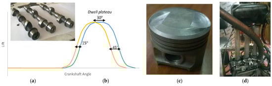 (a) Inlet camshafts tested (left to right): stock, dwell 45, dwell 50; (b) outline of the dwell 45 cam profile; (c) machined piston (with 45° edge) and (d) long inlet pipes installed at intake to avoid LIVC charge backflow.