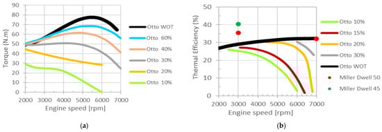 (a) Measured torque as a function of engine speed, for various positions of the throttle position sensor (TPS) for the stock K75 engine and (b) comparison between experimental values of the stock (lines) and over-expanded (dots) engine efficiencies.