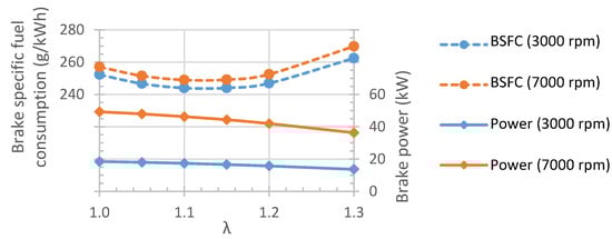 On the overall, an intake camshaft with a dwell of 45° and a CR of 19:1 was selected as the proposed solution. The camshaft with a dwell of 50 yielded 15.7 kW and an efficiency of 35.4% at 3000 rpm, while the camshaft with a dwell of 45 provided 16.4 kW and an efficiency of 40.5%. These tests were performed with a lean mixture of λ = 1.15. When comparing to the stock engine also at 3000 rpm and producing similar levels of power, the throttle had to be closed between 30% and 50% and the efficiency (see Figure 5b, line for WOT) was 29%. This gave an improvement of the engine with the dwell 45 camshaft of almost 40% in terms of efficiency (fuel consumption) for that level of power. However, part of this improvement was related to the leaner conditions of the over-expanded engine. If fact, the simulations for this engine (stock) showed that the best brake specific fuel consumption (BSFC, Figure 6) would be for λ = 1.15, with an improvement of 5%.
