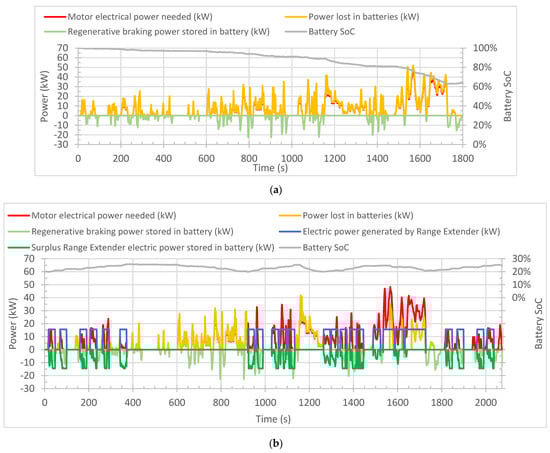 The operation under CD mode can be observed through Figure 7a for a whole WLTC cycle. It may be seen that the RE is never tuned on as the minimum SoC for CS activation (20%) is never achieved. The electrical power needed by the motor also never exceeds the battery power, so the RE does not need to be turned on. It may be seen that the power lost in the batteries is always slightly higher than the motor requirements due to the efficiency of the battery. The regenerative braking events are also clearly seen as negative values. To estimate the CD range, the WLTC was repeated sequentially with the CS mode being only achieved at the beginning of the third consecutive WLTC cycle, for a distance around 53 km.