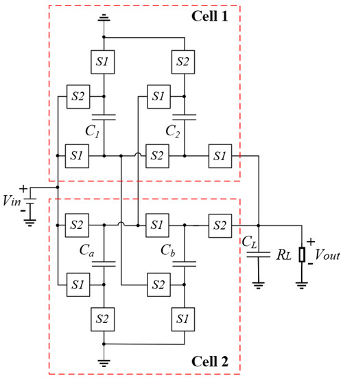 Switched capacitor converters (SCCs) have been utilized for low-power applications such as wearable devices and energy harvesting systems [1,2,3,4,5,6,7,8,9,10]. This is because the SCCs do not have magnetic components and it reduces their sizes and weights [11]. Up to now, various kinds of SCCs have been suggested and developed, e.g., Dickson [12,13], series-parallel [14,15,16], multilevel modular [17,18,19], Fibonacci [20,21,22], etc. The Fibonacci SCC (FSCC) can provide high boosted output with the smallest size [23,24,25]. However, the output ripple voltage, power efficiency, and conversion ratio of the FSCC can be improved. For this reason, a cross-connected Fibonacci switched capacitor converter (CCFSCC) was suggested and analyzed in recent studies [26,27]. By merging two FSCCs and cross-connecting them, the CCFSCC generates its boost conversion ratio of with a smaller output ripple voltage, where n is the stage of charging cells consisting of three switches and one capacitor.