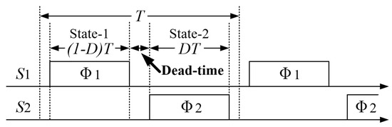 Figure 1 shows the cross-connected Fibonacci switched capacitor converter (CCFSCC) with its four times step-up mode, where is the average input voltage, is the average output voltage, and are semiconductor switches, are flying capacitors, is the load resistor, and is the output capacitor [27]. The CCFSCC consists of two cross-connected FSCCs (Cells 1 and 2). It is operated by turning on and off switches ( and ). They are controlled by the pulse width modulation (PWM) signals ( and ) with its dead-time, as described in Figure 2, where and are for State-1 and State-2, T is the operation period during one cycle, and D is its duty ratio. In terms of the duty ratio D, the CCFSCC features a symmetric construction. Therefore, the duty ratio D is designated as 50%.