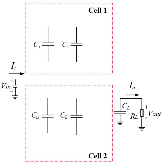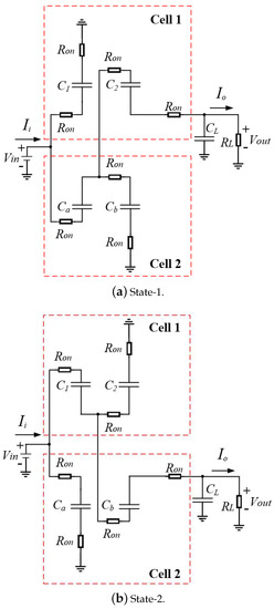 The CCFSCC in [26,27] was analyzed based on a four-terminal equivalent circuit model [28], in which the analysis neglects circuit parameters such as its operation frequency and capacitances of capacitors. Some analysis methods consider these parameters, e.g., slow and fast switching limit model [29,30,31] and charge-balance transient method [32,33,34]. In [29,30,31], a target circuit is modeled with an assumption of its 50% duty ratio. In addition, this method neglects analysis parameters such as on-resistors of switches and variation in voltages of capacitors. In [32,33,34], an SCC is examined based on the fundamental circuit laws such as Kirchhoff’s voltage law (KVL), Kirchhoff’s current law (KCL), and RC network solving methods. This analysis method can accurately model the SCCs compared with their simulations. However, the method in [32,33,34] calls for complex calculations as circuit components increase because all of capacitors’ voltages must be derived.